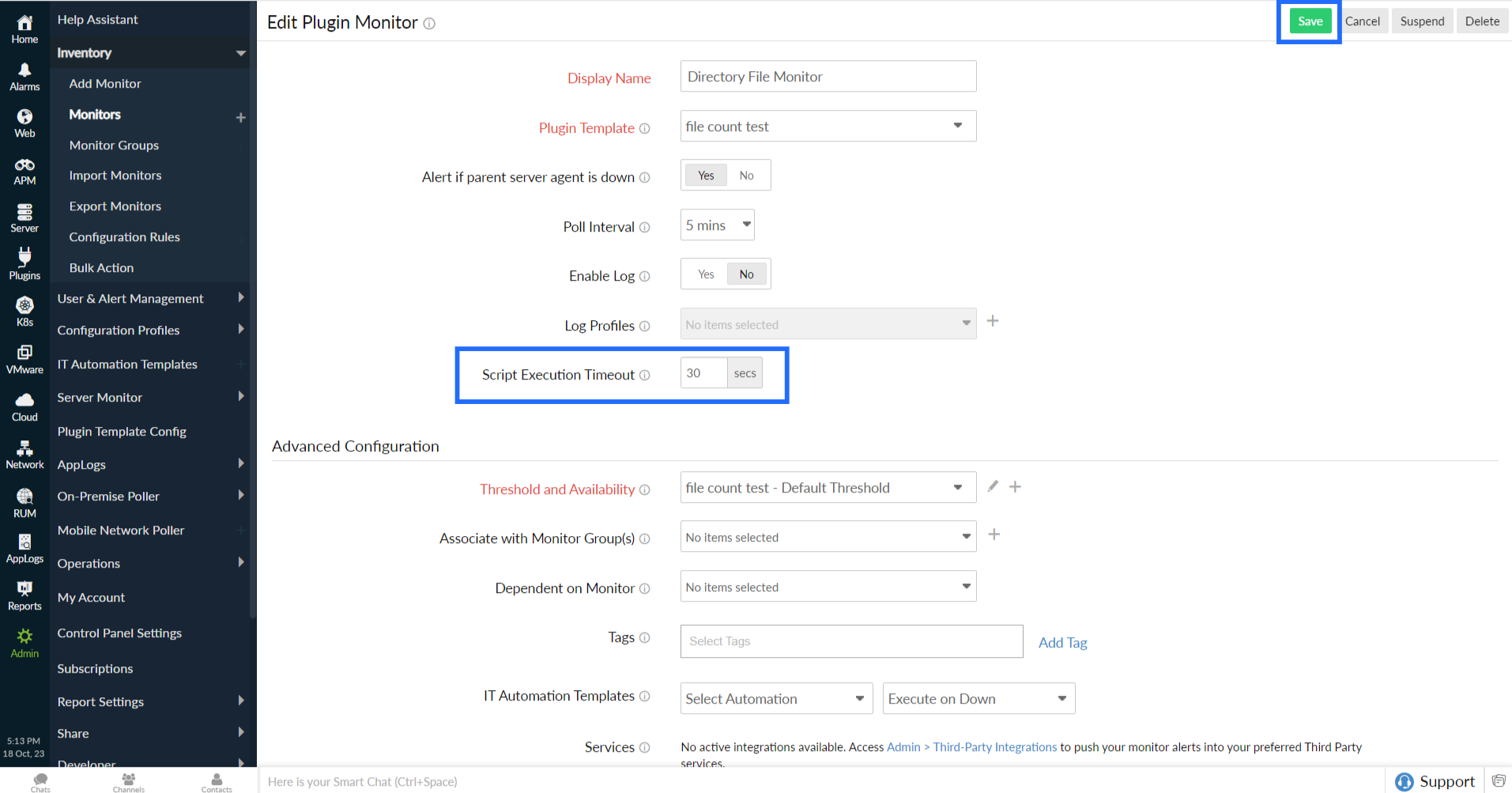 If polling has stopped for existing plugin monitors because the plugin script execution timed out, follow the steps below to increase the Script Execution Timeout value in the Site24x7 web client: