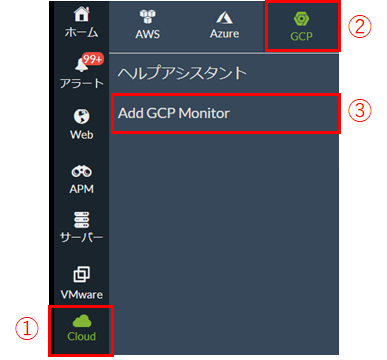 2. [Cloud] → [GCP] → [GCP監視の追加 (Add GCP Monitor)]の順でクリックします。