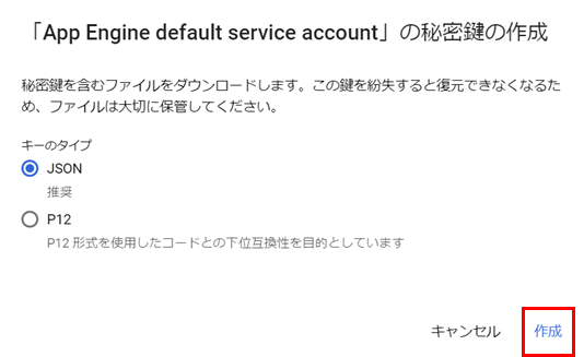5. キーのタイプで「JSON」を選択し、[作成]をクリックします。
