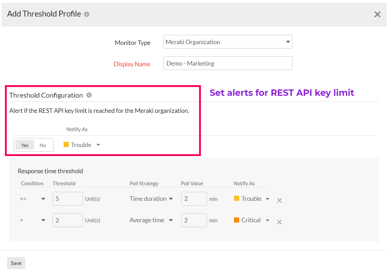 Once the Add Threshold Profile pop-up displays, under the Threshold Configuration section, toggle the Alert if the REST API key limit is reached for the Meraki organization option to Yes. This is set to Yes by default.