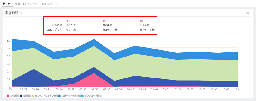 Site24x7の多くのWeb監視(インターネットサービス監視)では、「応答時間」というメトリクスが取得されます。サマリータブには次のような応答時間のウィジェットが表示されています。そこで、応答時間とスループットの平均値、最小値、最大値を把握できます。