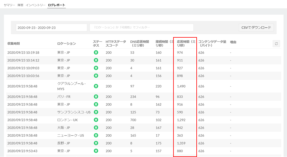しかし、同じ監視のログレポートを表示して、応答時間欄を参照すると最大値が上の画像の「1.25秒」を超過していることがわかります。