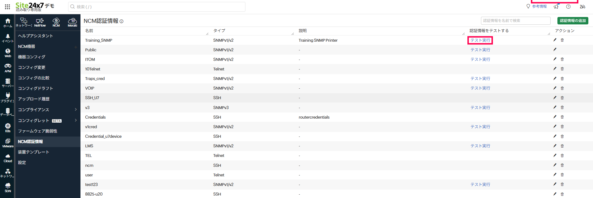 - 認証情報テストをせずに追加した場合、[ネットワーク]→[NCM]→[NCM認証情報]に移動し、認証情報をテストする配下の[テスト実行]をクリックしてください。成功する場合は、上記の「認証情報のテストに成功するが、バックアップに失敗する」を確認してください。