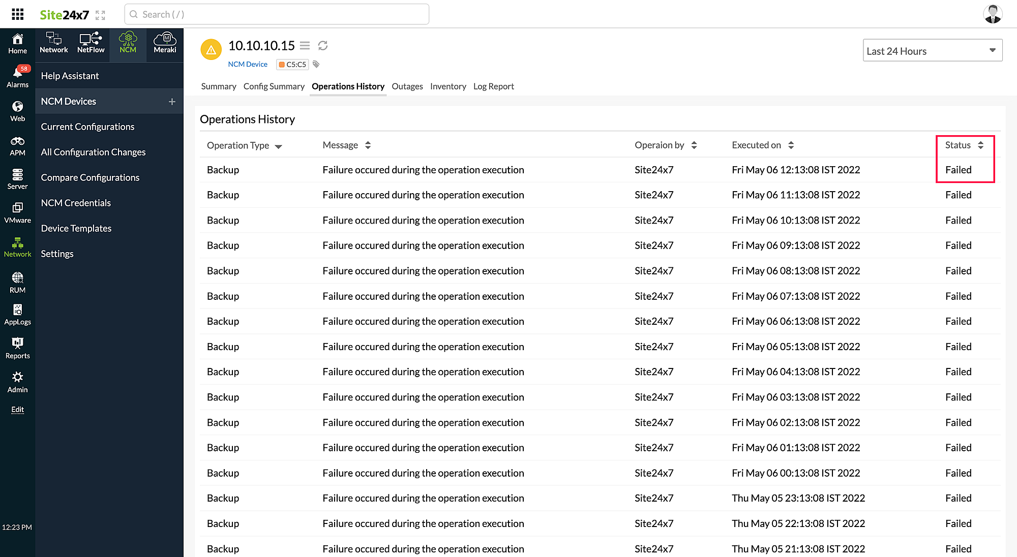 [NCM]→[NCM機器]→[操作履歴(Operations History)]で、バックアップステータスが失敗している場合、次の項目を確認してください。