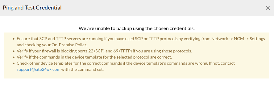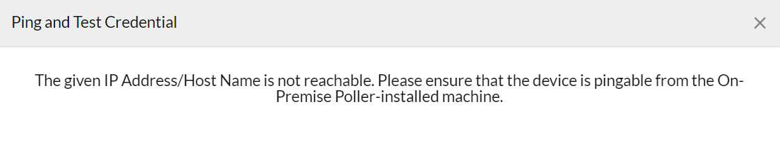 When you click Test Credential, as mentioned above, it may show that your IP Address or Host Name is not reachable. In this case, check if the device is reachable from the On-Premise Poller machine.