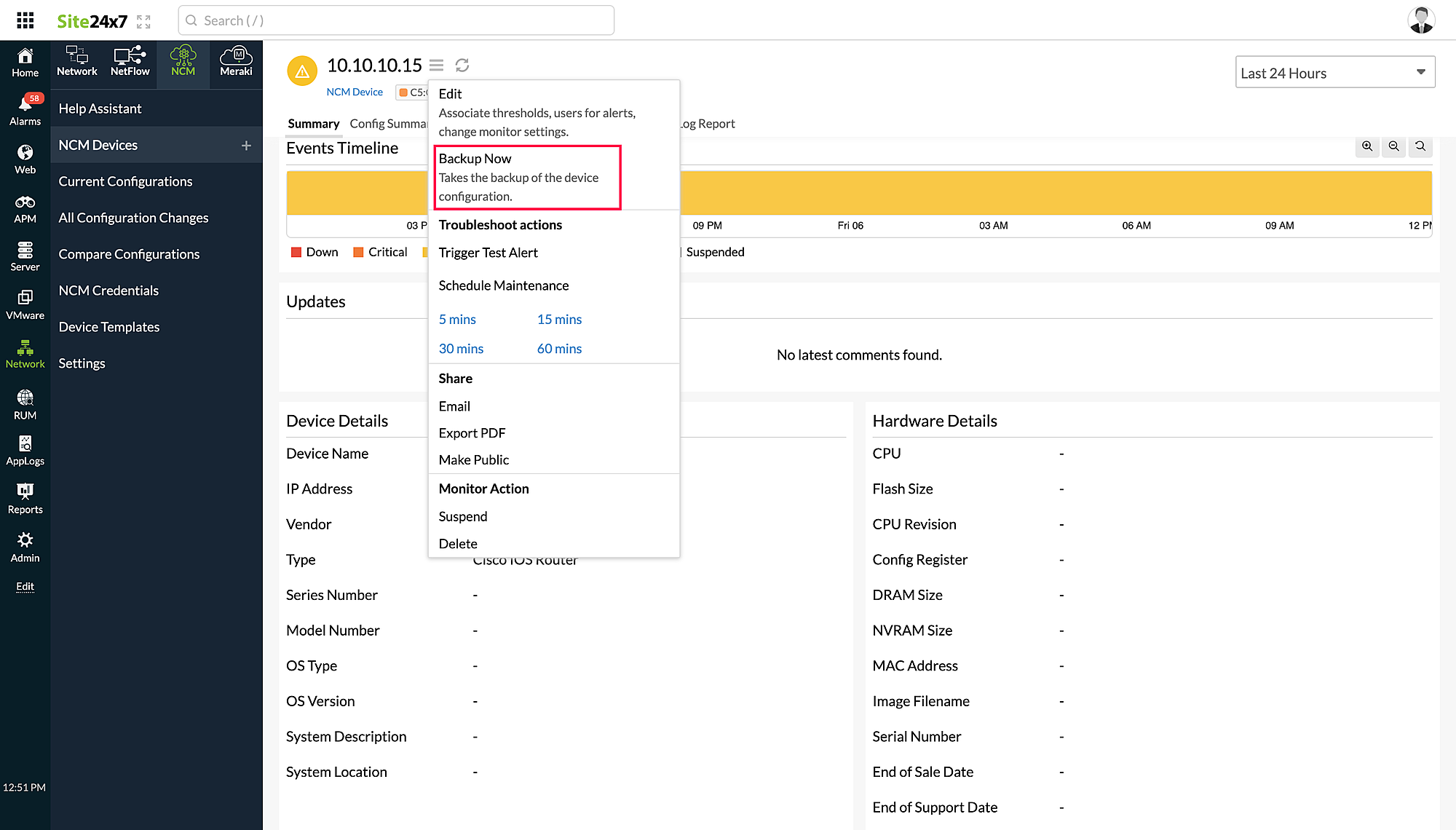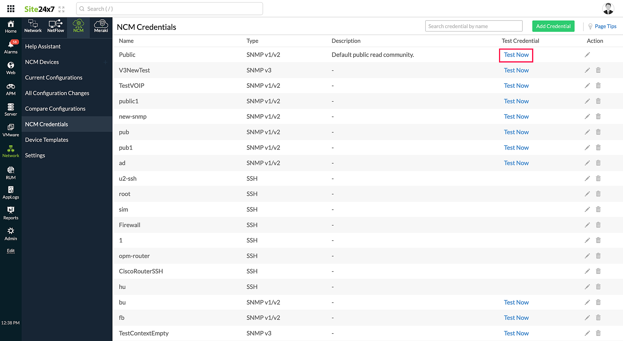 - The NCM device has been added without choosing the Test Credential option. This means the credentials have not been tested before the device addition. In this case, navigate to Network > NCM > NCM Credentials and click Test Now under Test Credential.