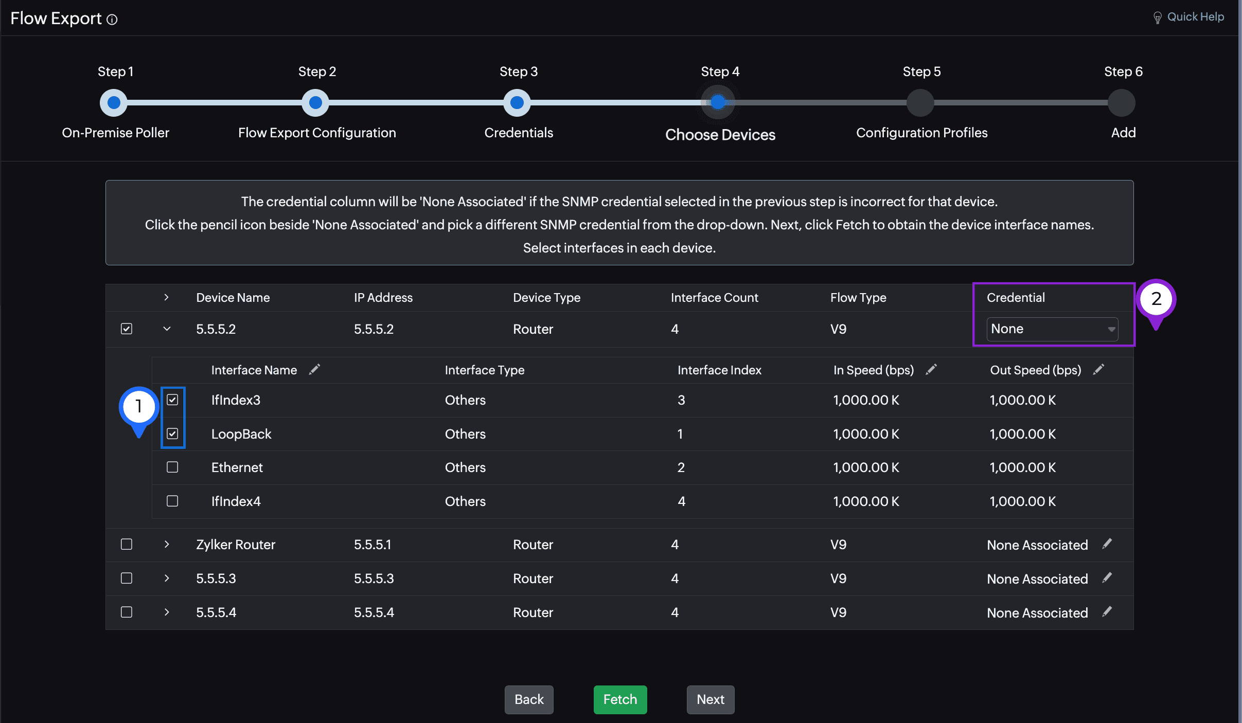 adding the NetFlow monitor, when you select the interfaces on the device(marked as 1 in the image), choose the right credentials in the