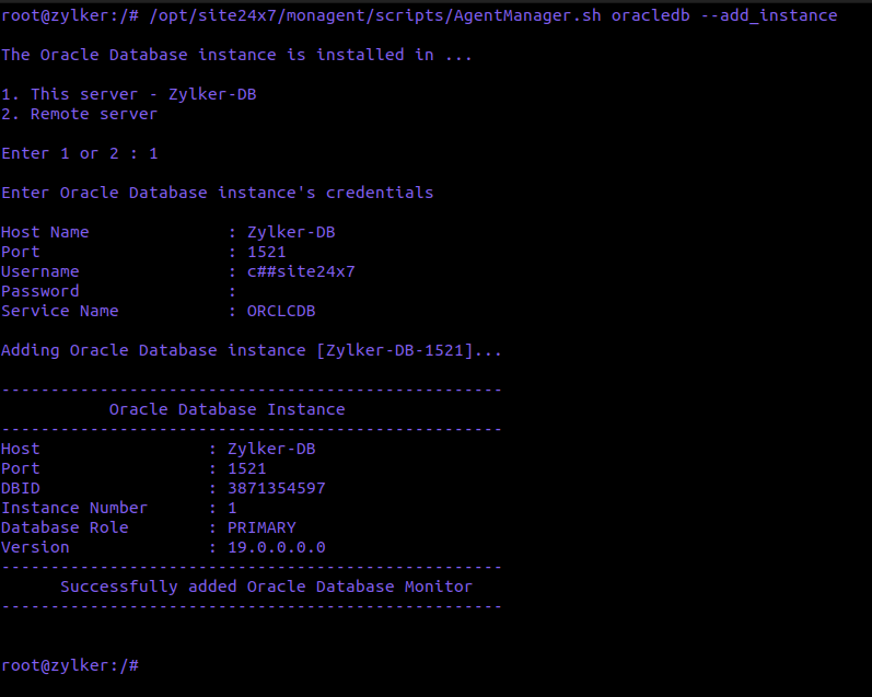 Execute the following command in your terminal and enter your Oracle Database instance's username and password as well as the Host Name, Port, and Service Name for the Site24x7 agent to authenticate and configure Oracle monitoring: