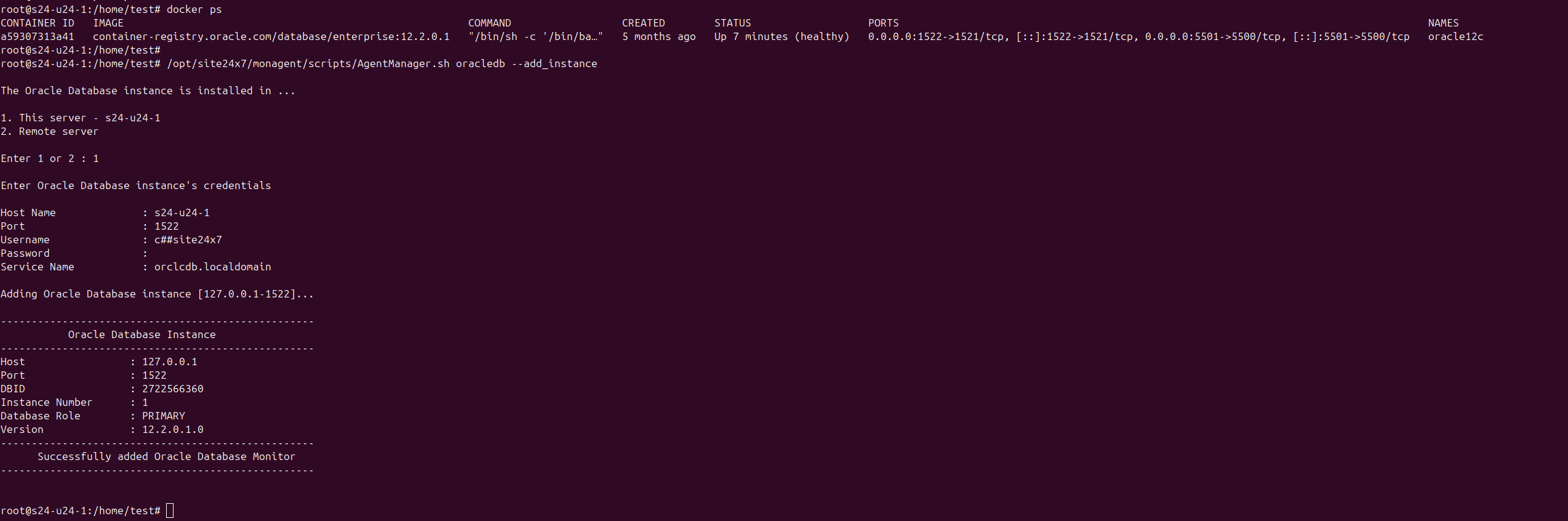 /opt/site24x7/monagent/scripts/AgentManager.sh oracledb --add_instance - Choose This server option, and provide the Host port that is mapped to the Oracle listener in the container, the User name, Password, and Service name to add the Oracle Database for monitoring.