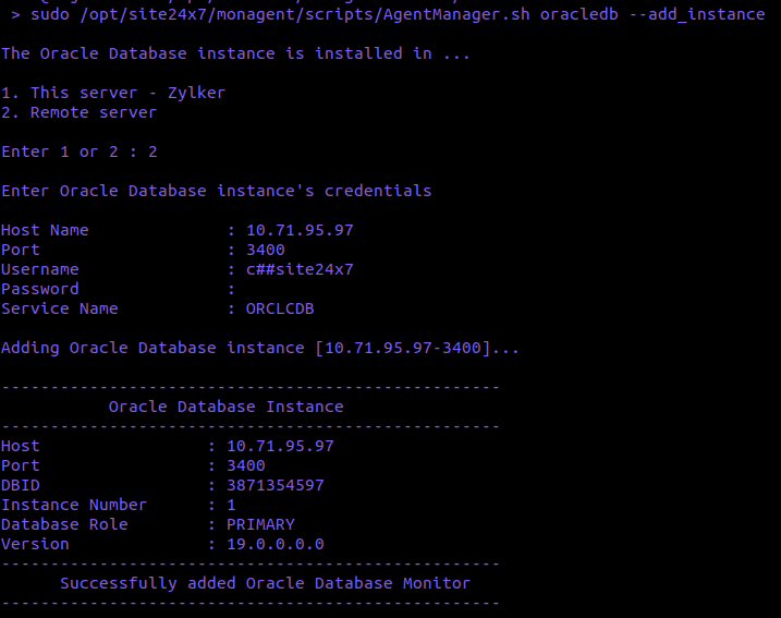 To monitor your Oracle Database hosted in a Docker container, follow these steps: Log in to Site24x7 and install the Site24x7 Linux monitoring agent. Execute the following command in your terminal and enter your Oracle Database instance's username ...