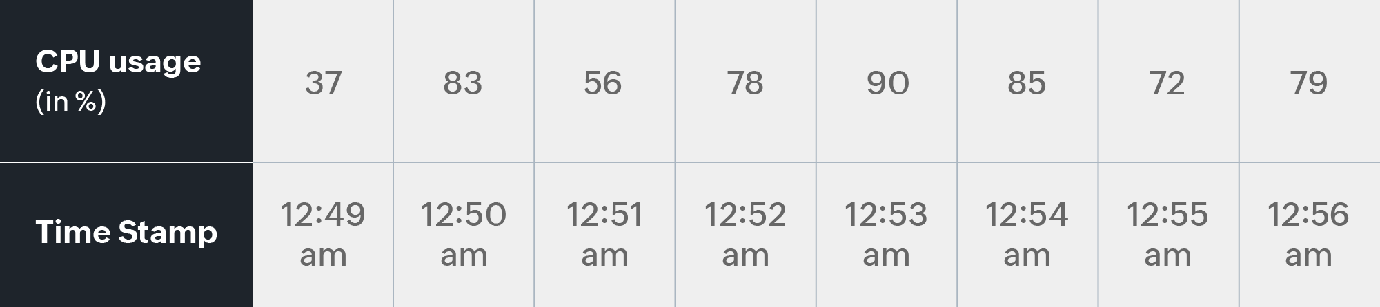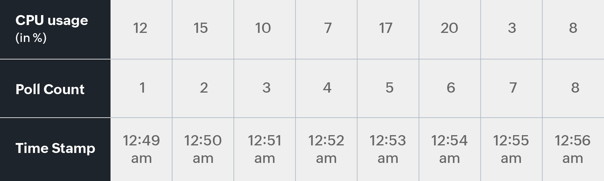 Poll count refers to the number of times Site24x7 checks the status of a resource (such as CPU usage) within a predefined period (like five minutes). If a threshold value is breached during five consecutive poll counts, a Trouble alert is sent to the users. For instance, let the threshold value of CPU usage be 70%.