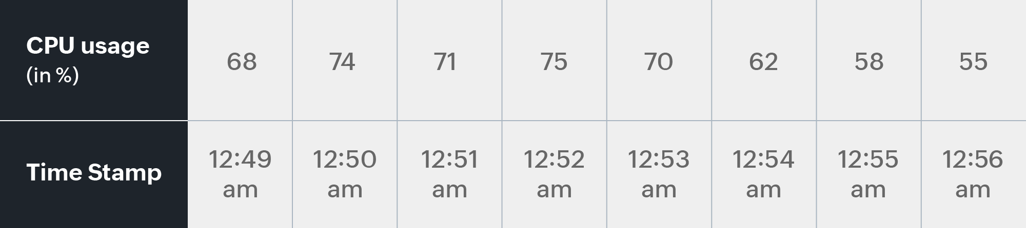 Sum of CPU usage for the first five minutes: 68+74+71+75+70 = 358