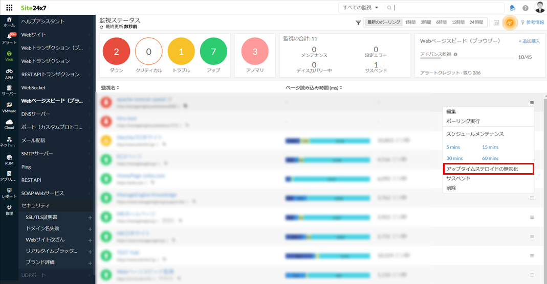 3. 無効化したい監視のハンバーガーアイコンにカーソルを合わせてドロップダウンリストを表示します。
