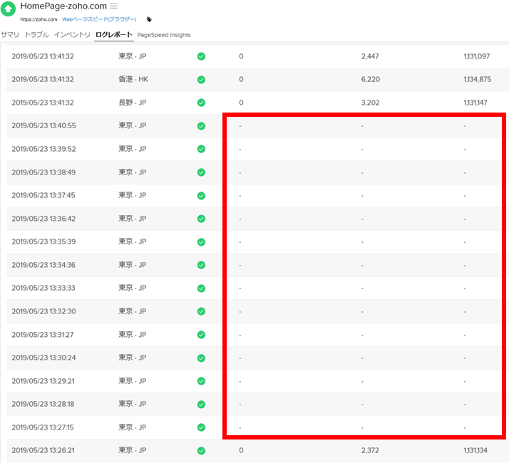 新機能であるアップステロイドチェックによって、ログレポートにこのような空レコードが表示されます。このチェックが約1分間ごとに行われることで、トラブルやダウンが起こった際にも即時にアラートを発生させることができます。