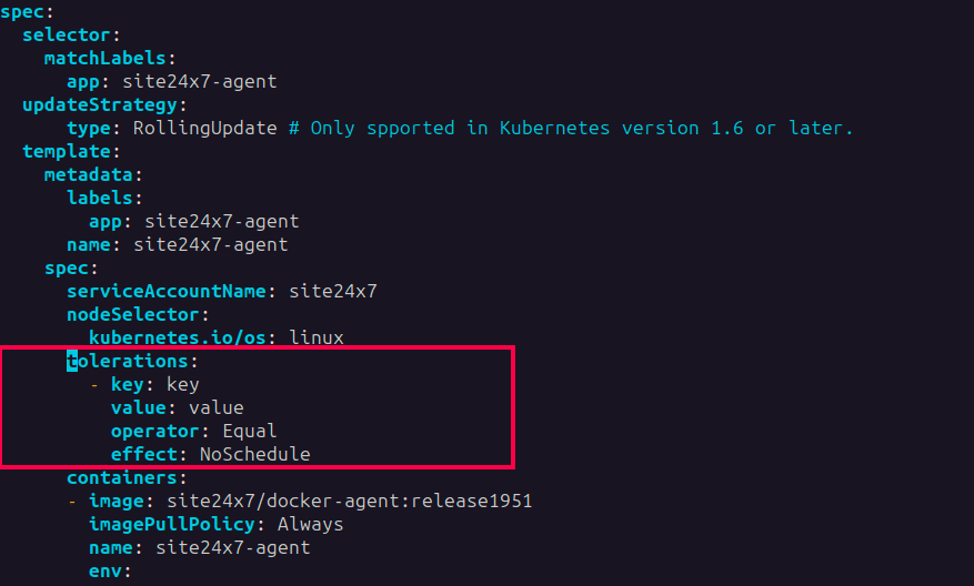 1. To configure tolerations for the Site24x7 agent DaemonSet for the above taints, open the downloaded site24x7-agent.yaml file and add the tolerations under the spec section as shown below: