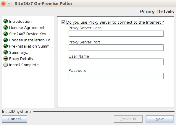 1. During installation using the wizard, check the option Use a Proxy Server and enter the proxy server hostname, port, username, and password.