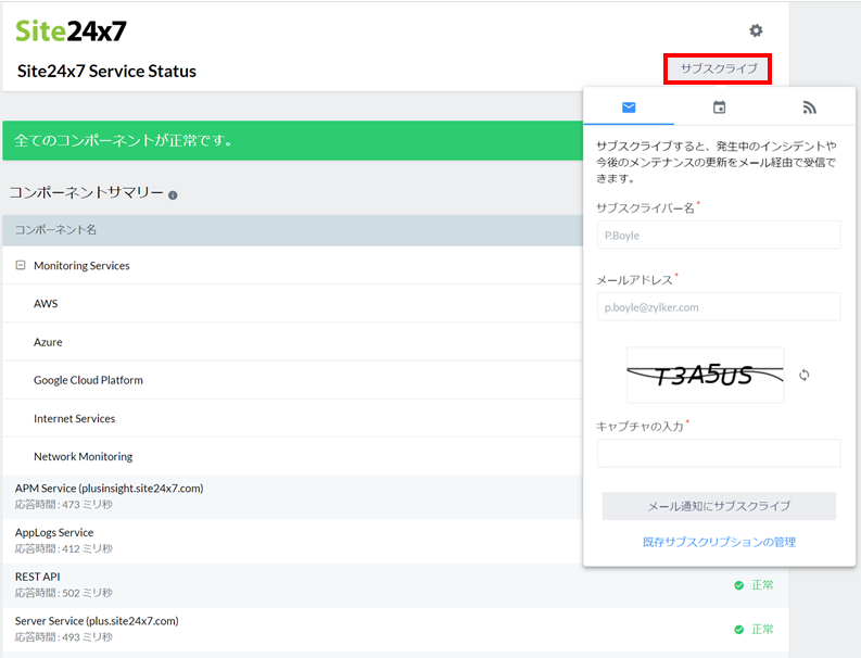 ページ内の[サブスクライブ]ボタンより、稼働状況に変更があった際に通知を受け取ることができます。