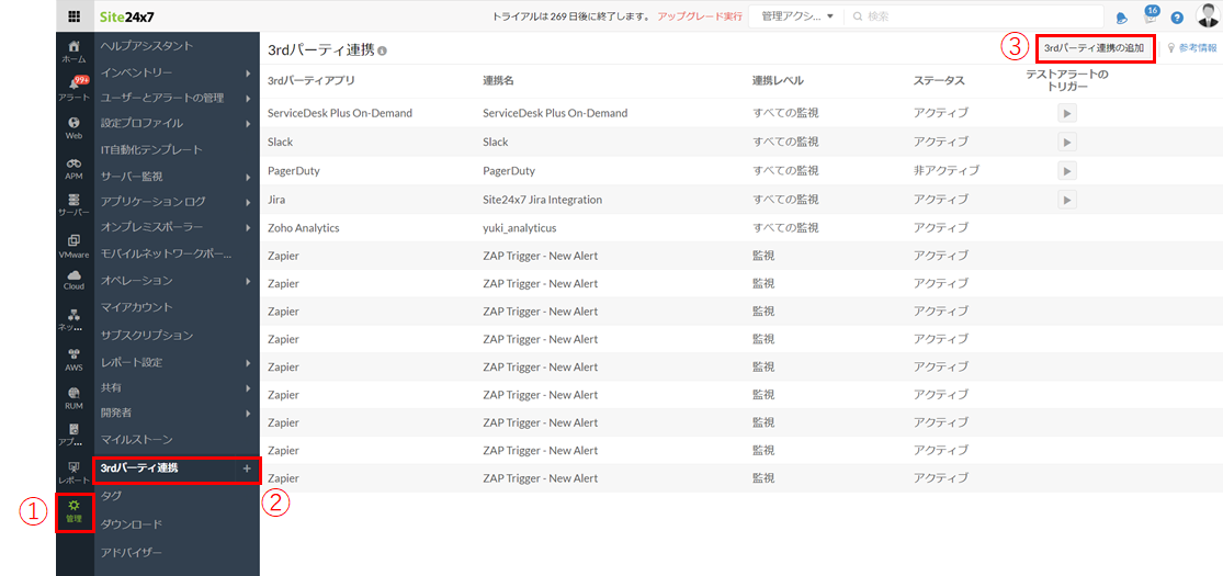 2. [管理] → [3rdパーティ連携] の順にクリック