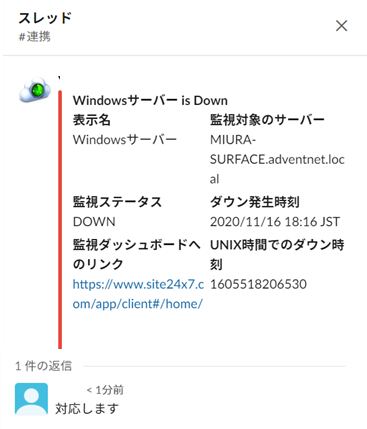 Slackとの連携により、障害が発生した際にチームメンバーとスムーズにコミュニケーションを取ることができ障害対応状況をリアルタイムに発信できます。