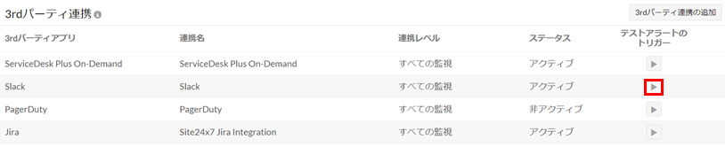 3. 表示されたリストで赤枠のSlackの テストアラート実行アイコン をクリック