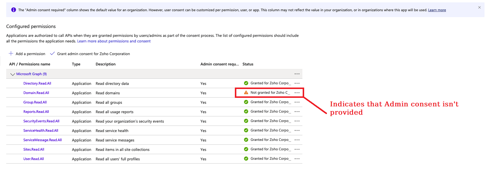 In the Configured permissions tab, check if all permissions have Admin consent. Without Admin consent, there will be data collection failure.