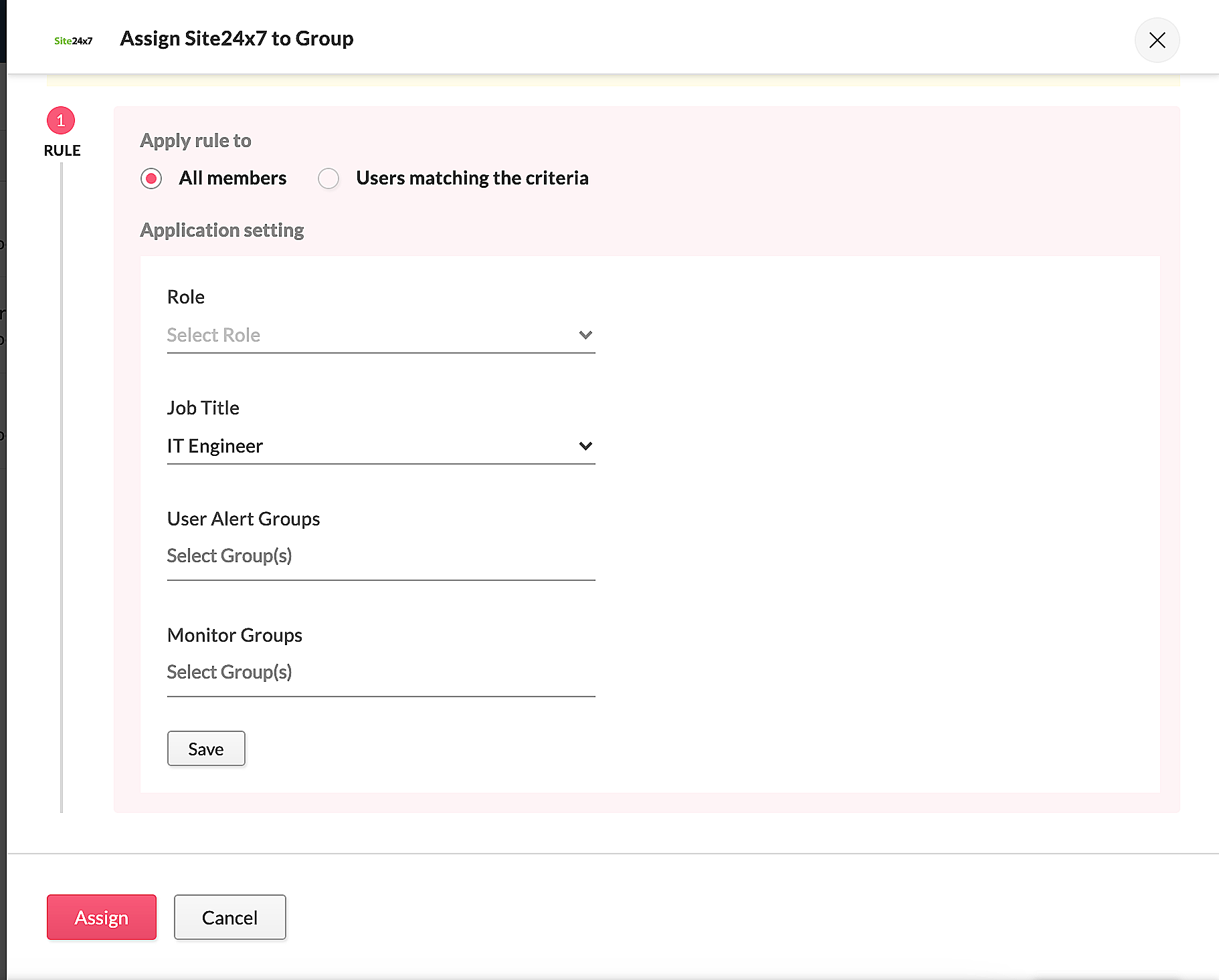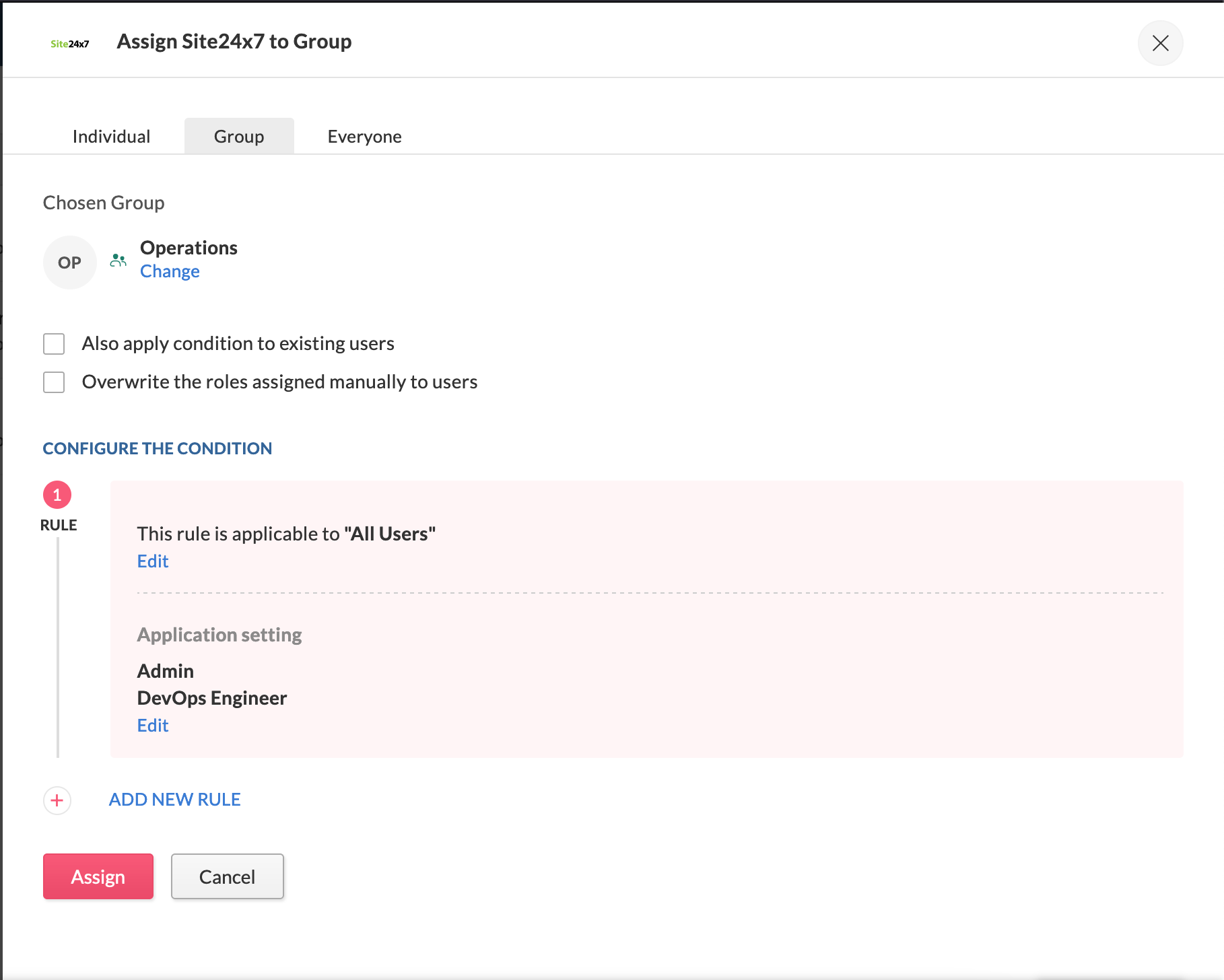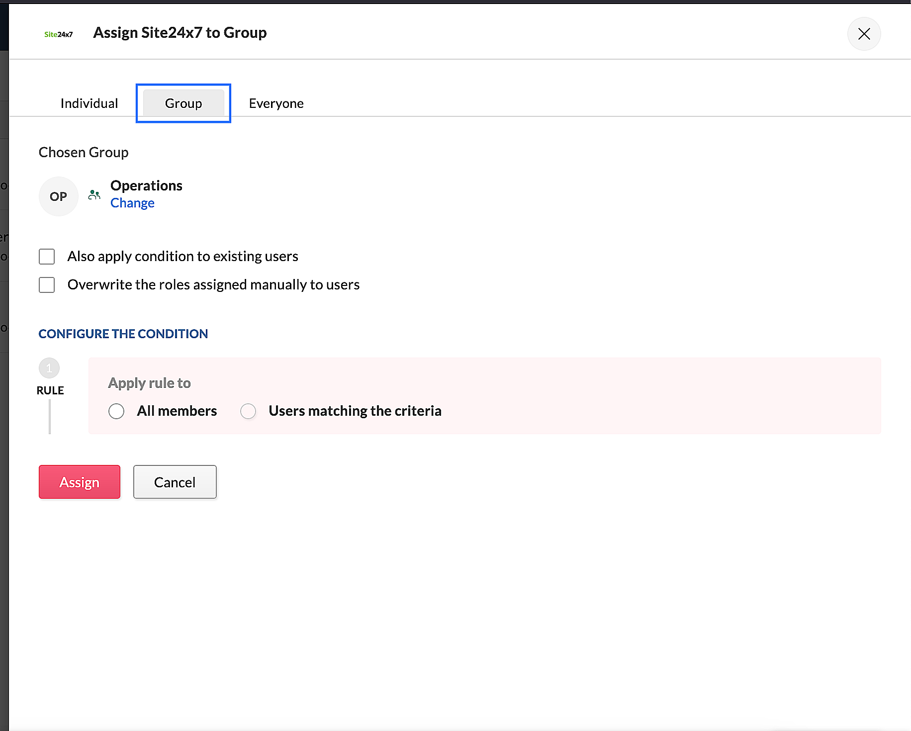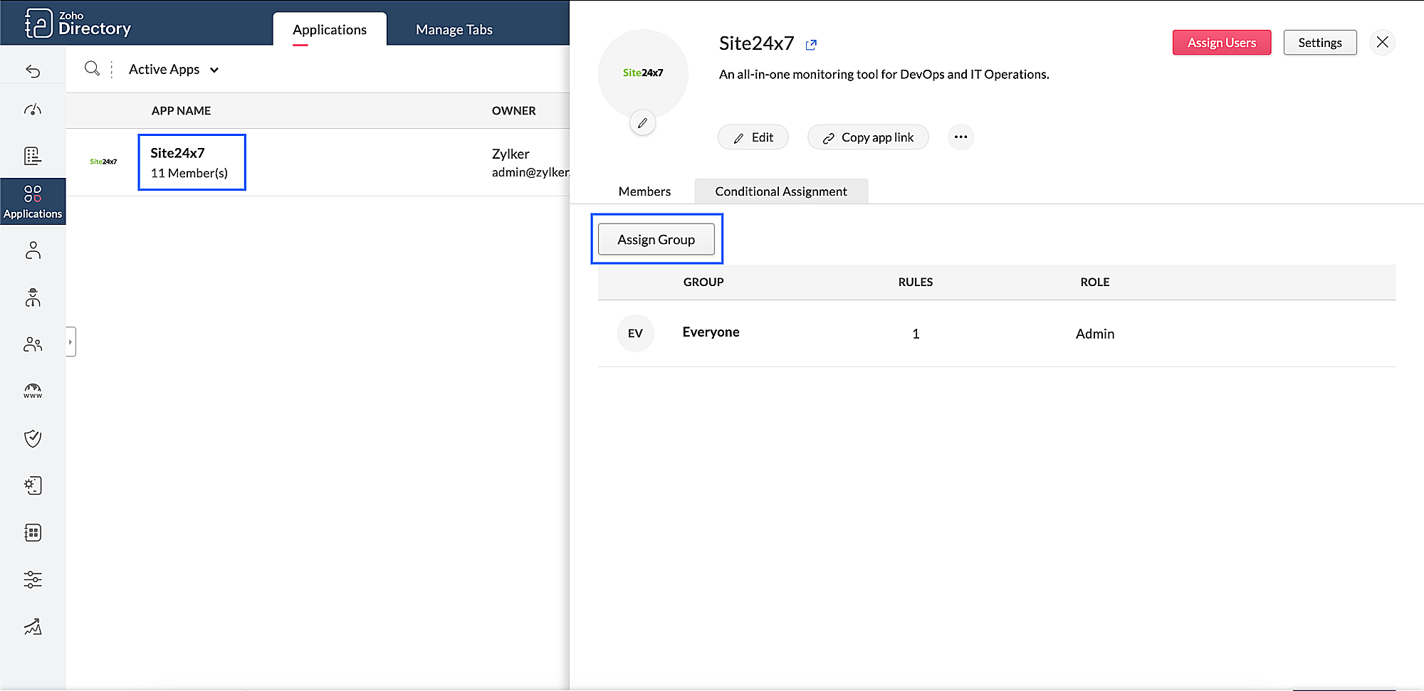 2. Click Site24x7 and on the form that opens, click Assign Group.