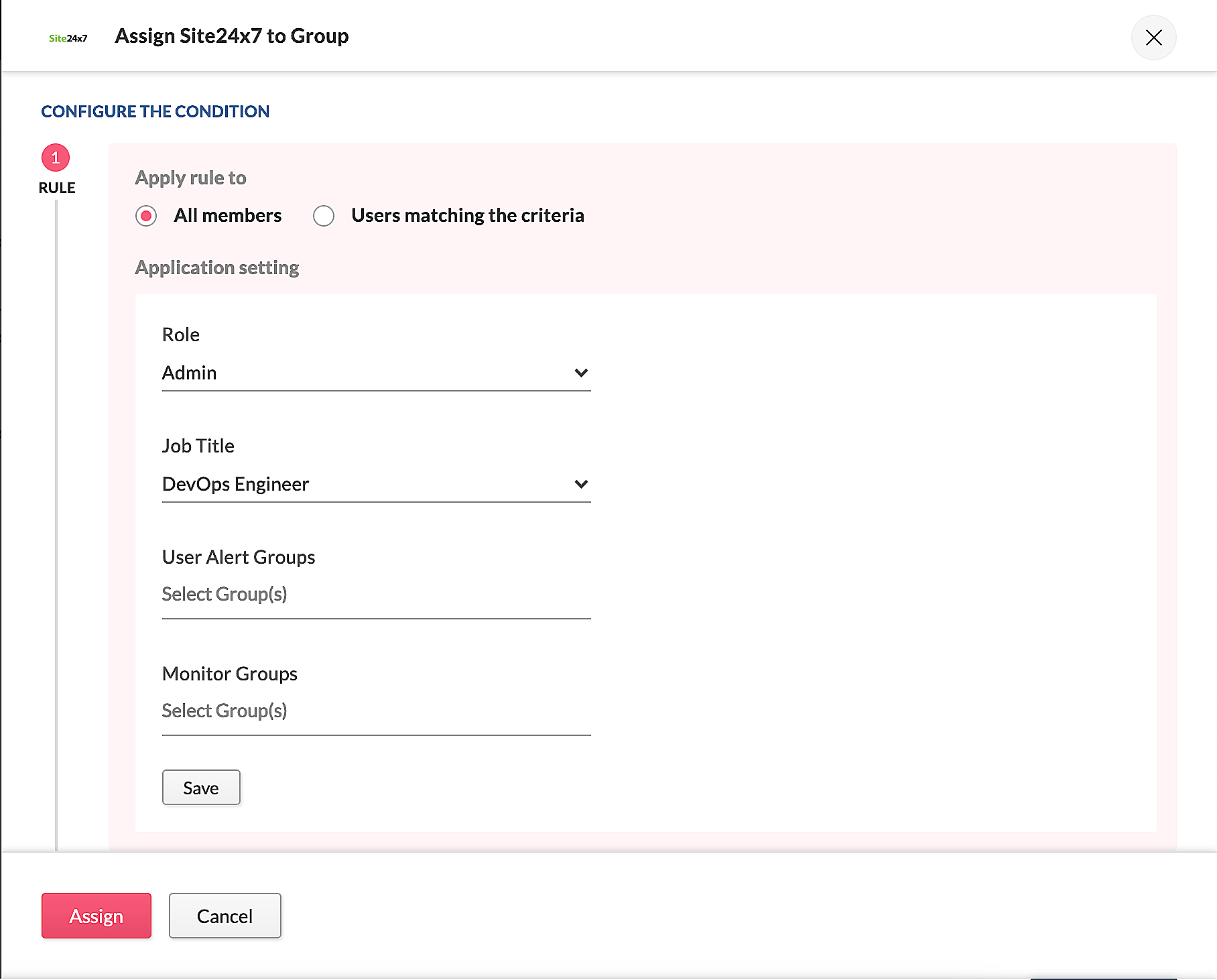 Conditional assignment has successfully been created in Zoho Directory for Site24x7.