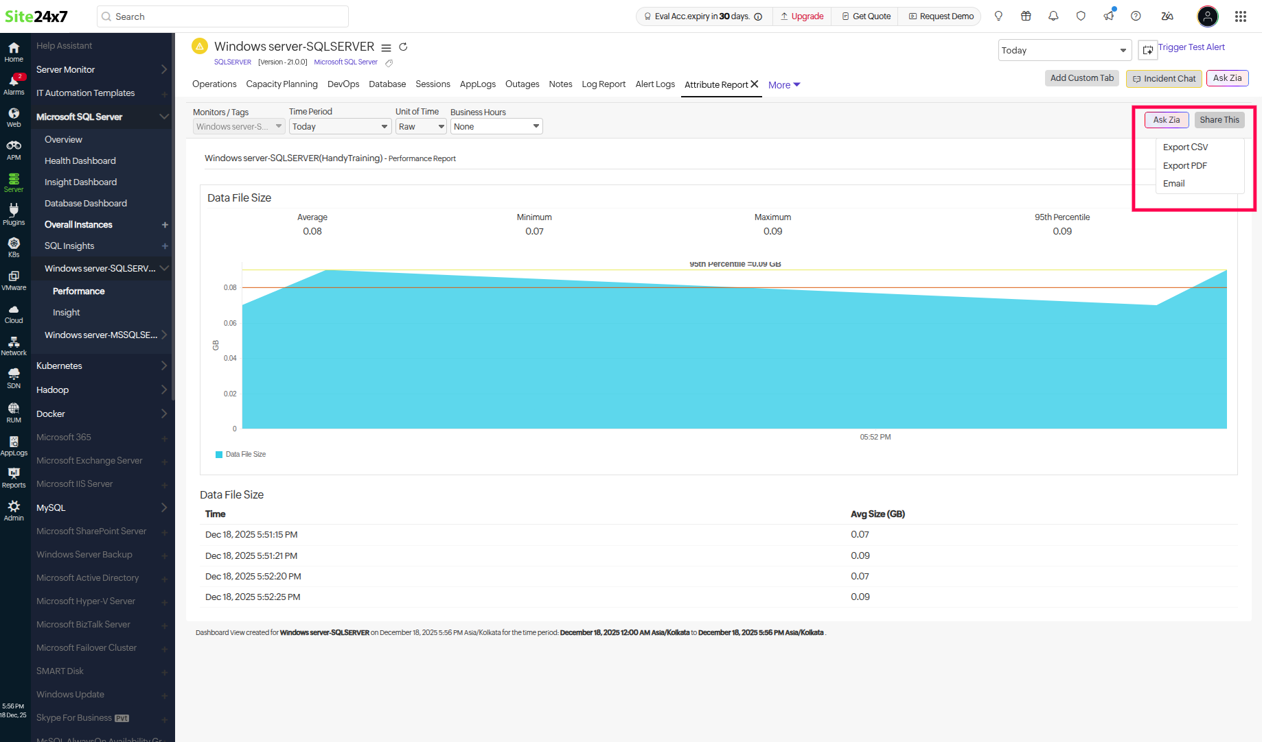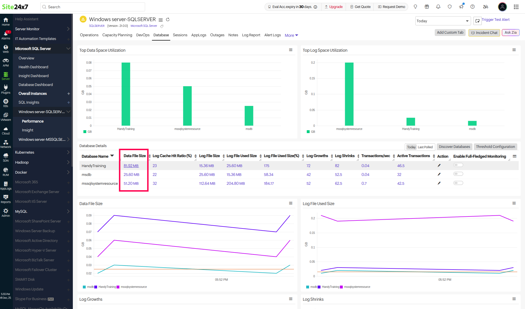 - Across the required database, click on the Data File Size.