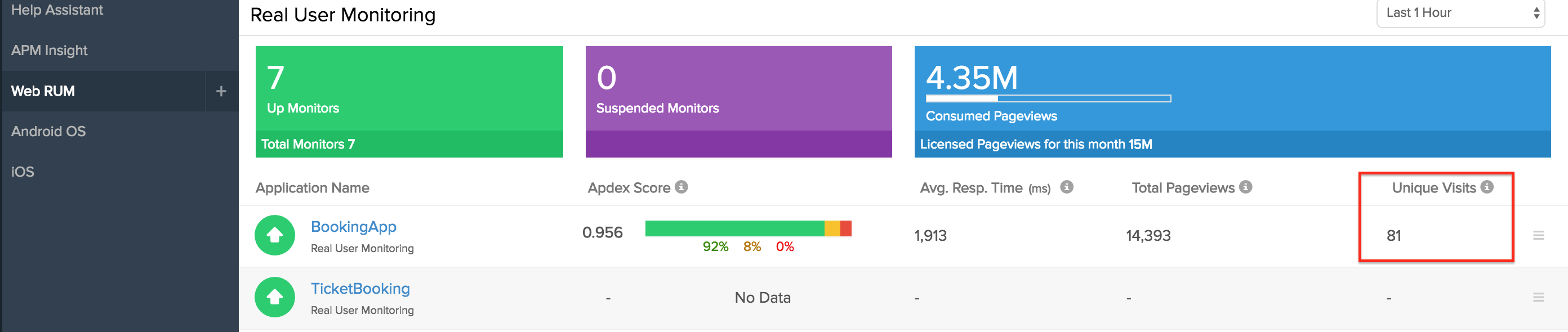 Site24x7のリアルユーザー監視(RUM)により、全体のアプリケーションのレベルで一意な接続数/訪問者の数を記録できます。これは各セッションでログインしたユーザーの数により計算されています。