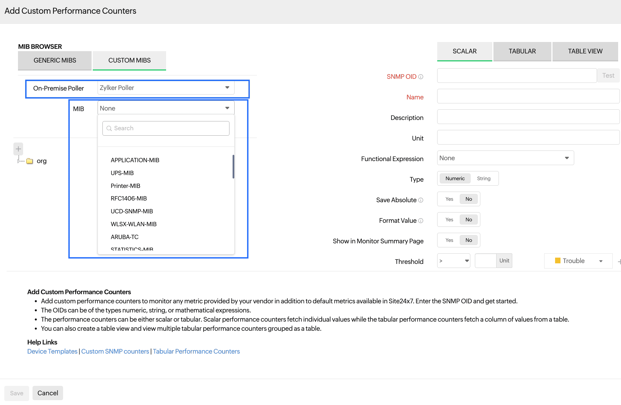 custom performance counters or SNMP traps easily, from the Site24x7 UI