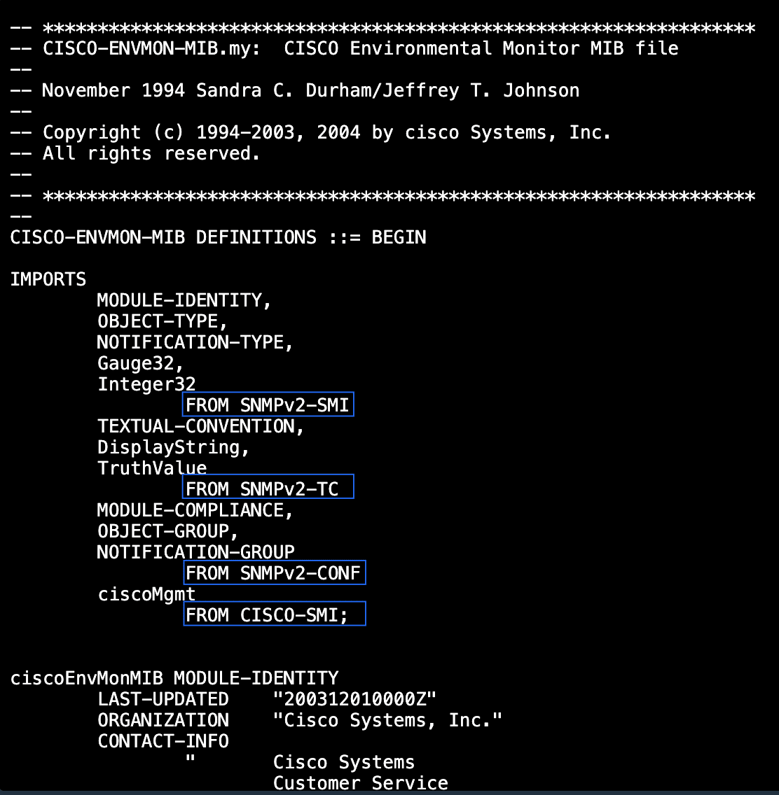 For example, in Figure 1, the highlighted MIB files under the IMPORTS section are the dependency files. These MIB files should be present in the {On-Premise Poller Home}\NetworkPlus\mibs directory.