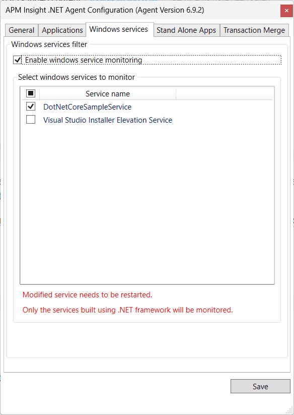 Under the Windows Services tab, ensure your service is selected for monitoring.