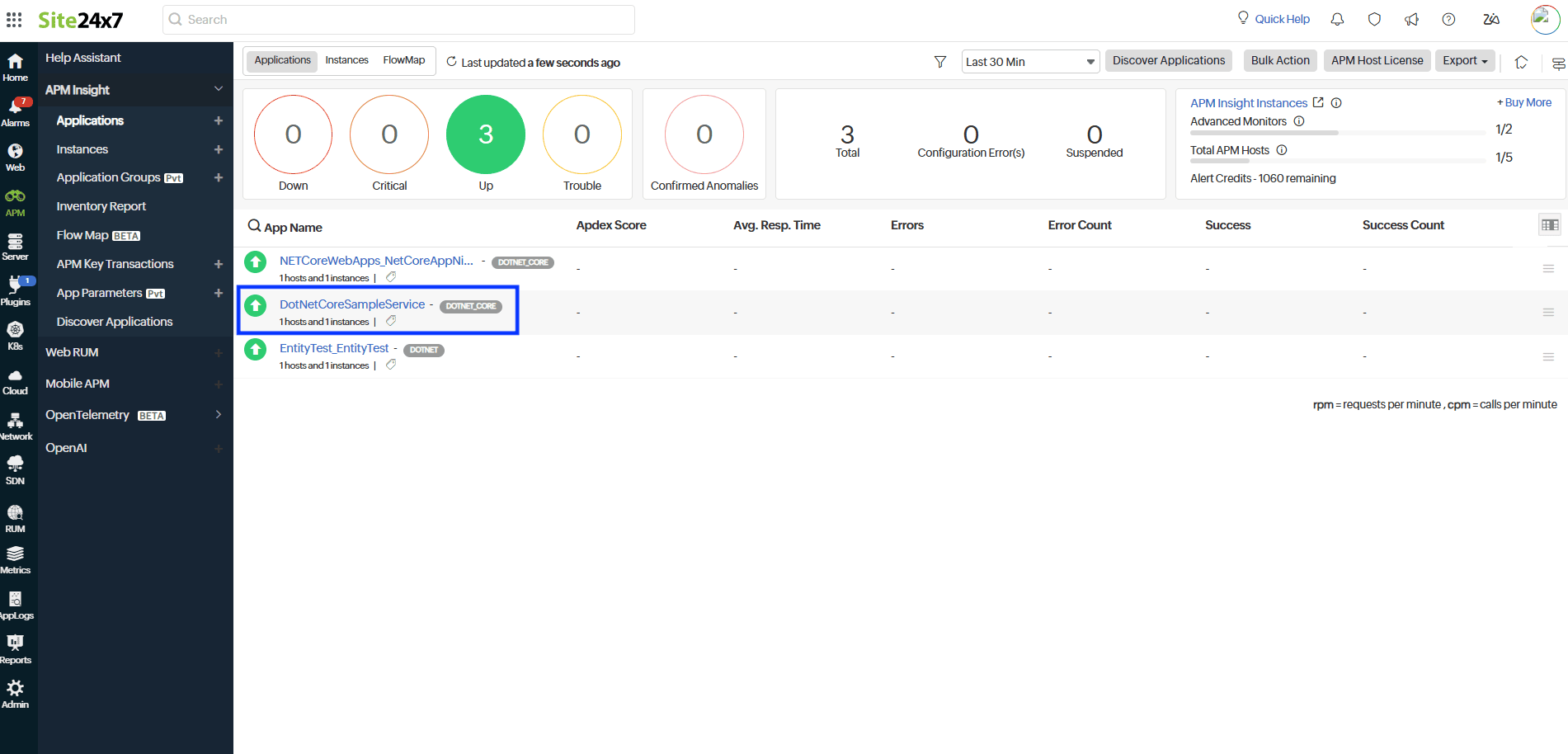 Once the service is running and starts processing, the APM Insight agent should begin capturing data, and the monitor should appear in the Site24x7 portal.