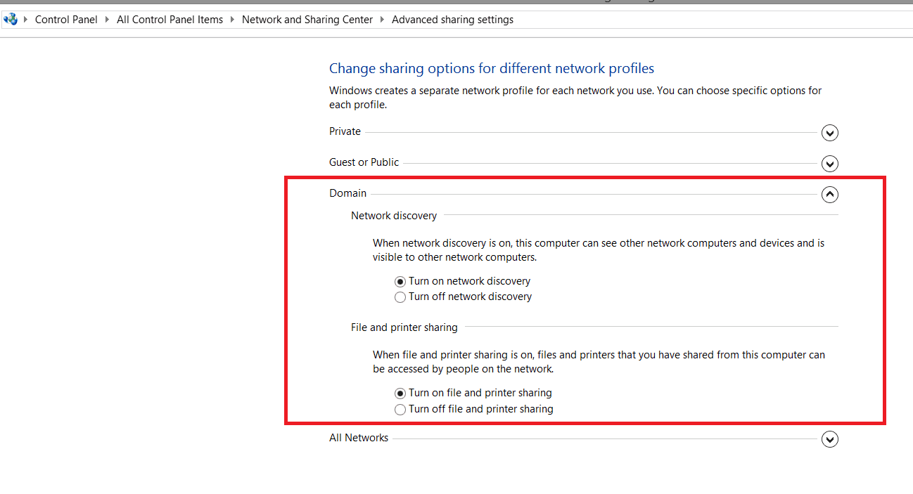 Error message: "Couldn't connect to \servername\ADMIN$. The network path was not found" | Go to Advanced Sharing Settings > Domain. Enable Network discovery and File and printer sharing. Refer to the screenshot below. |