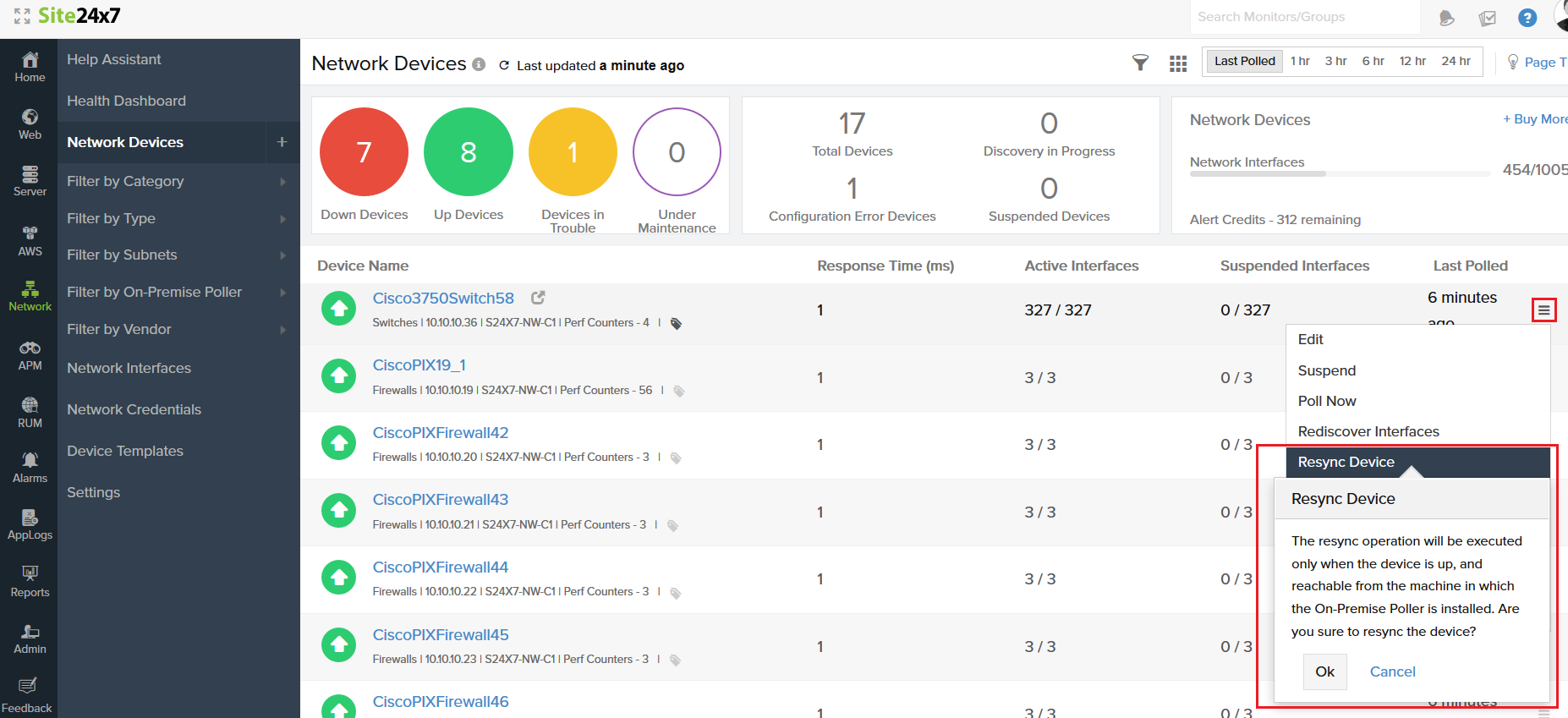 5. 再開されない場合、[ネットワーク]タブにアクセスし、各デバイスのハンバーガーアイコンで[装置の再同期]をクリックします。