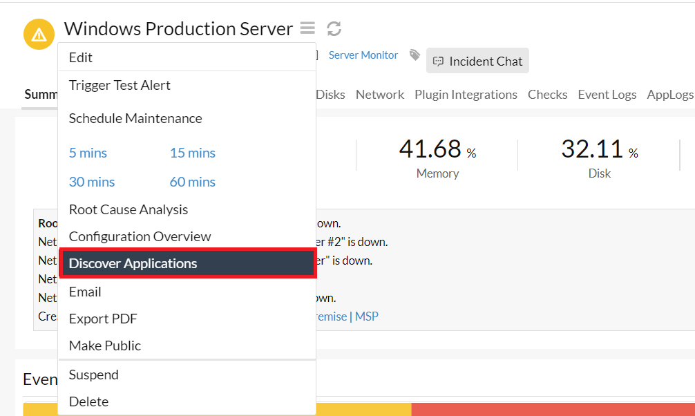 - Log in to Site24x7 and go to Server > Server Monitor > click on the associated server monitor. Beside the display name, hover on the hamburger icon and click Discover Applications. This will discover and add the applications for monitoring.