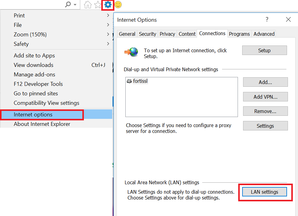 Go to the Internet Explorer browser > Settings (gear icon) > Connections > LAN Settings.
