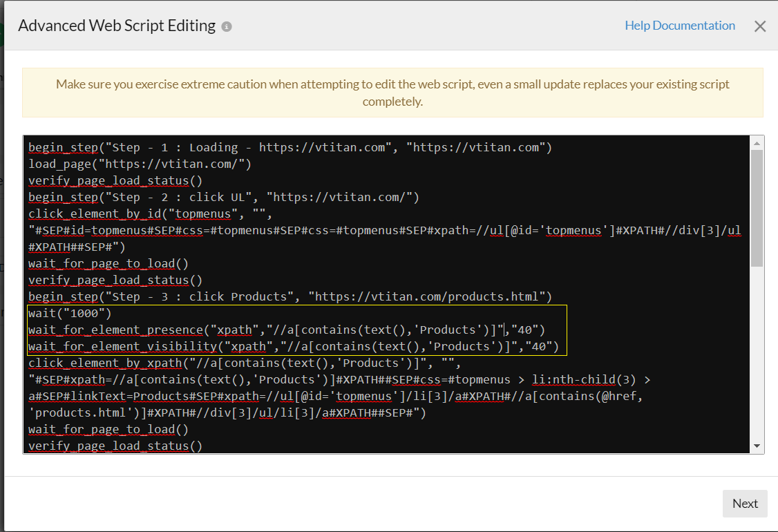 In the script that opens, add lines in the following format with appropriate values above the page elements that are unable to be located: