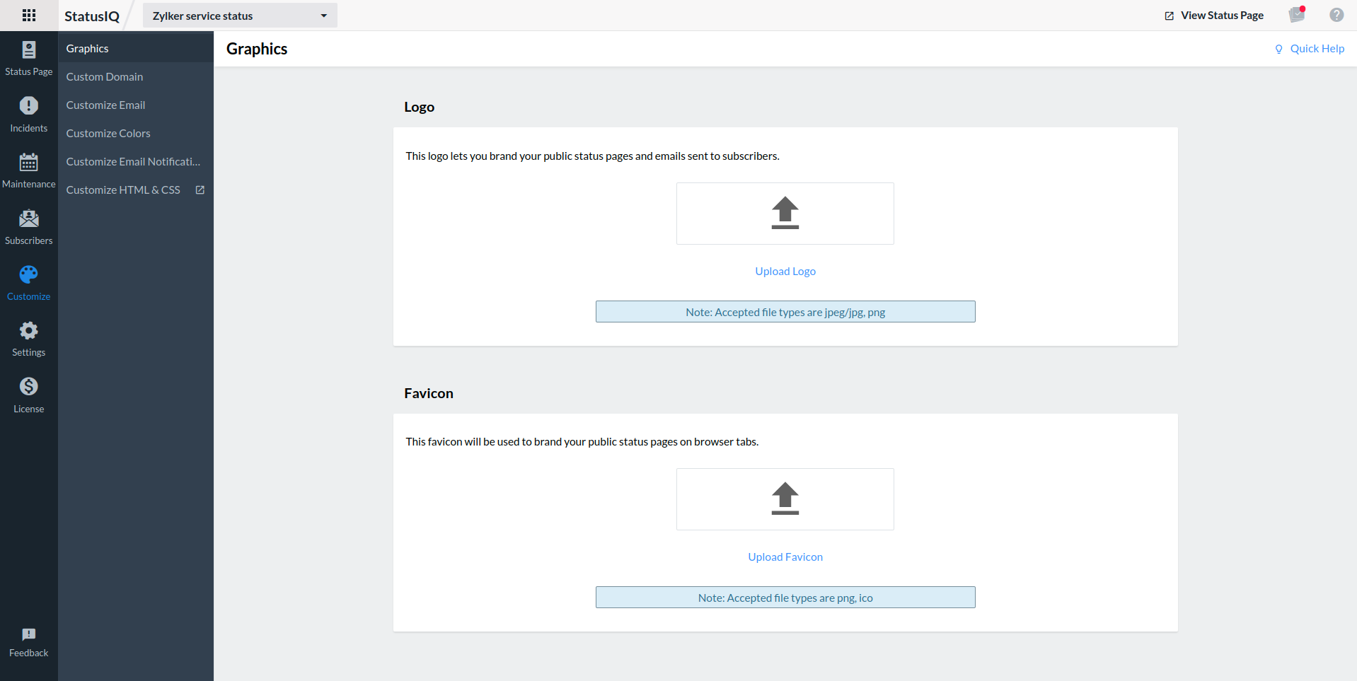 Having your company logo present in your status page helps to strengthen your brand's value. Site24x7 lets you brand your status page by adding your company logo. Follow the steps below to add a custom logo to your status page: